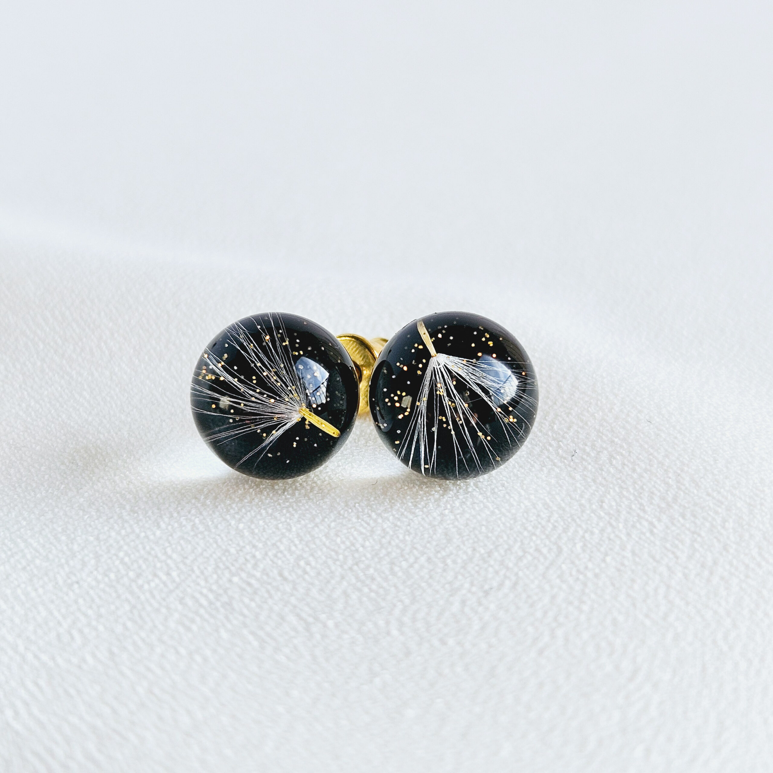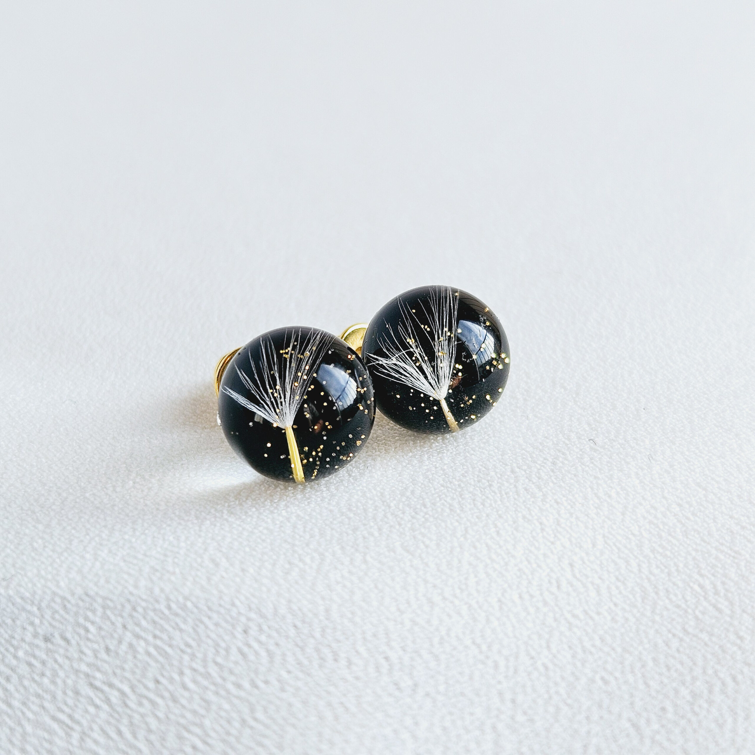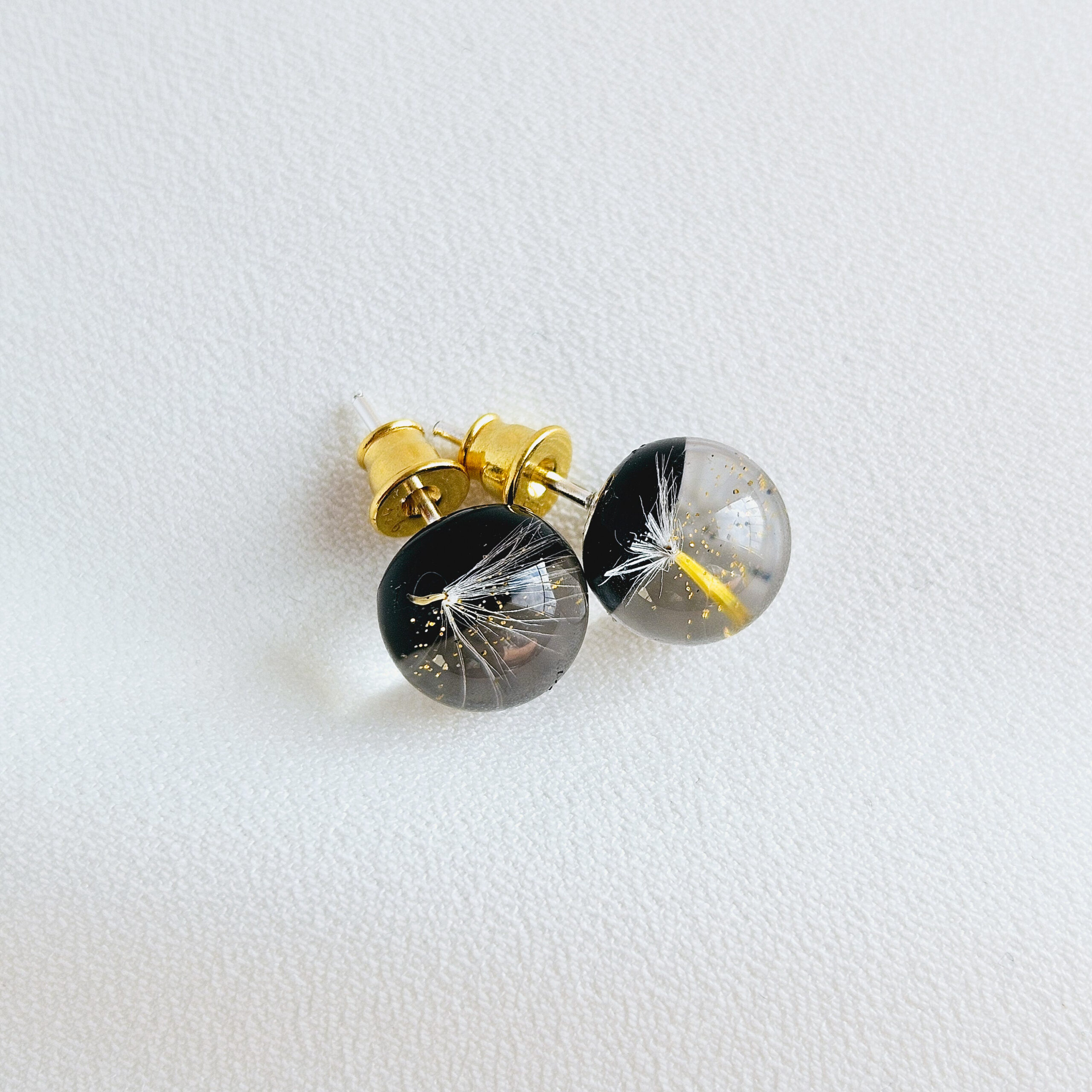 Boucles d’oreilles en résine de haute qualité avec des pissenlits et des paillettes dorées.