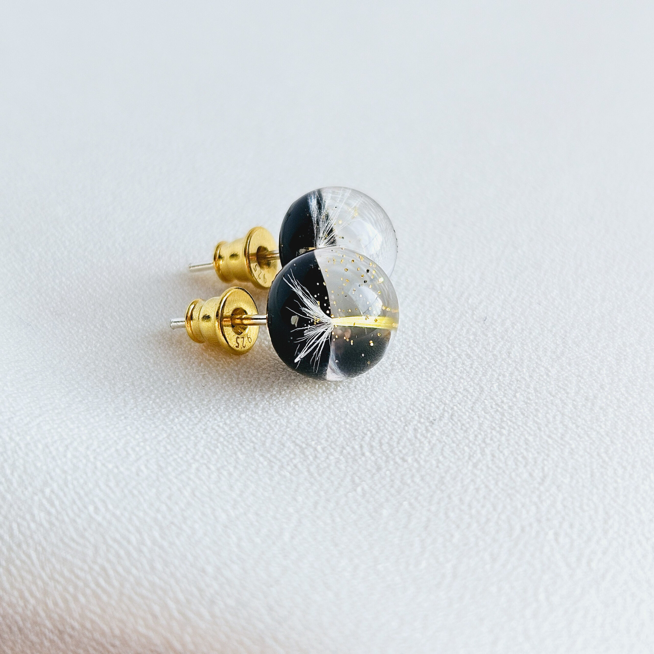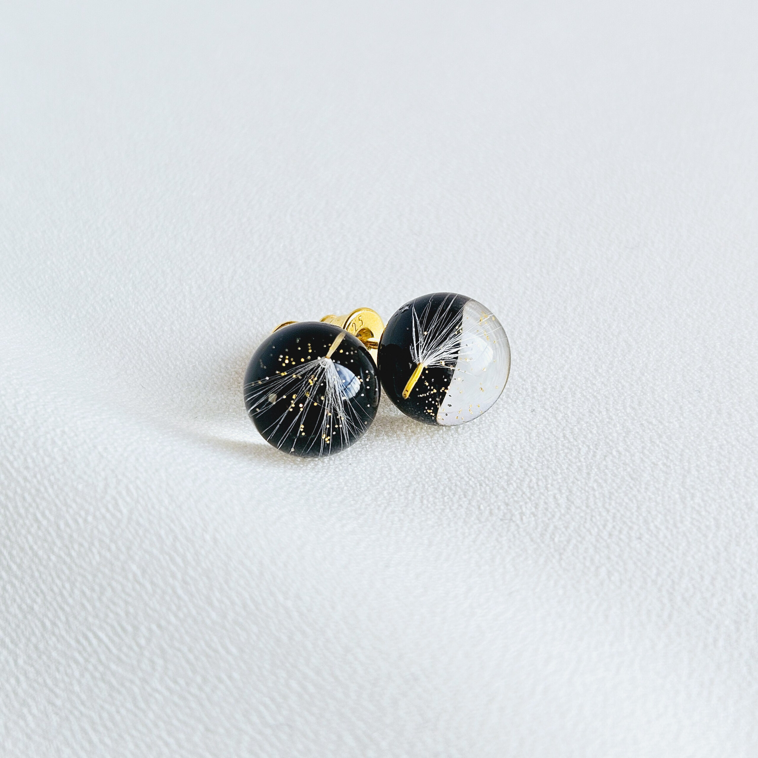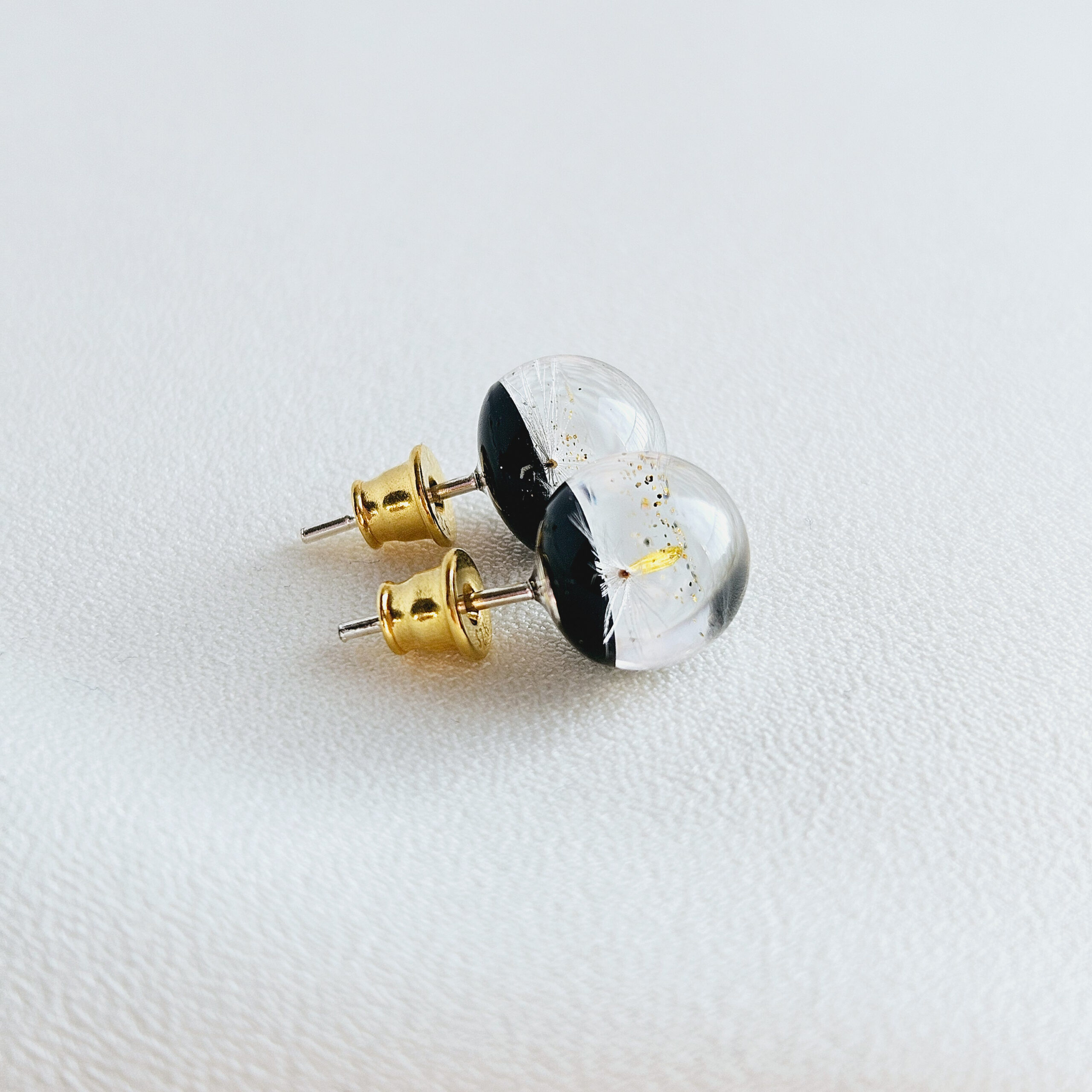 Boucles d’oreilles en résine de haute qualité avec des pissenlits et des paillettes dorées.