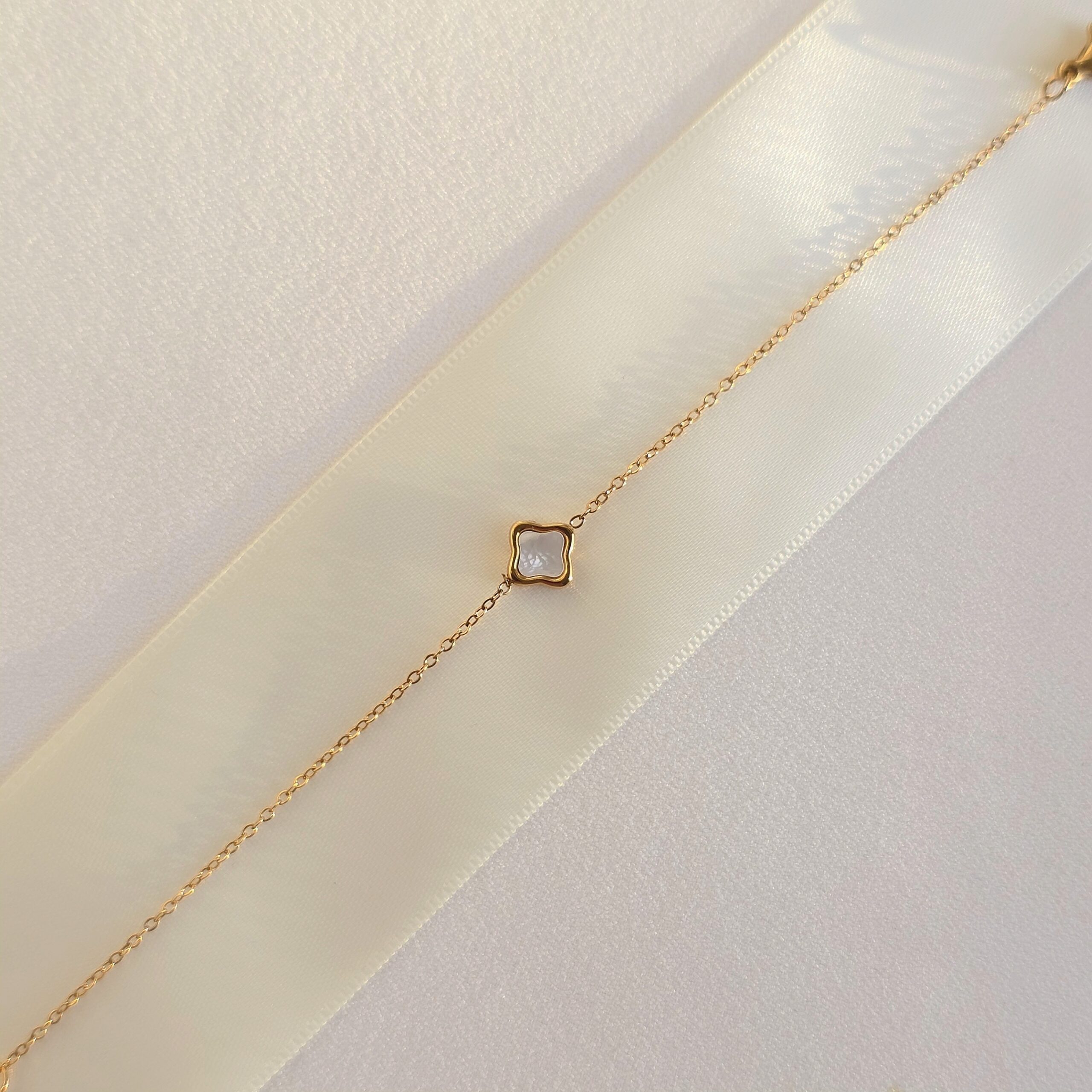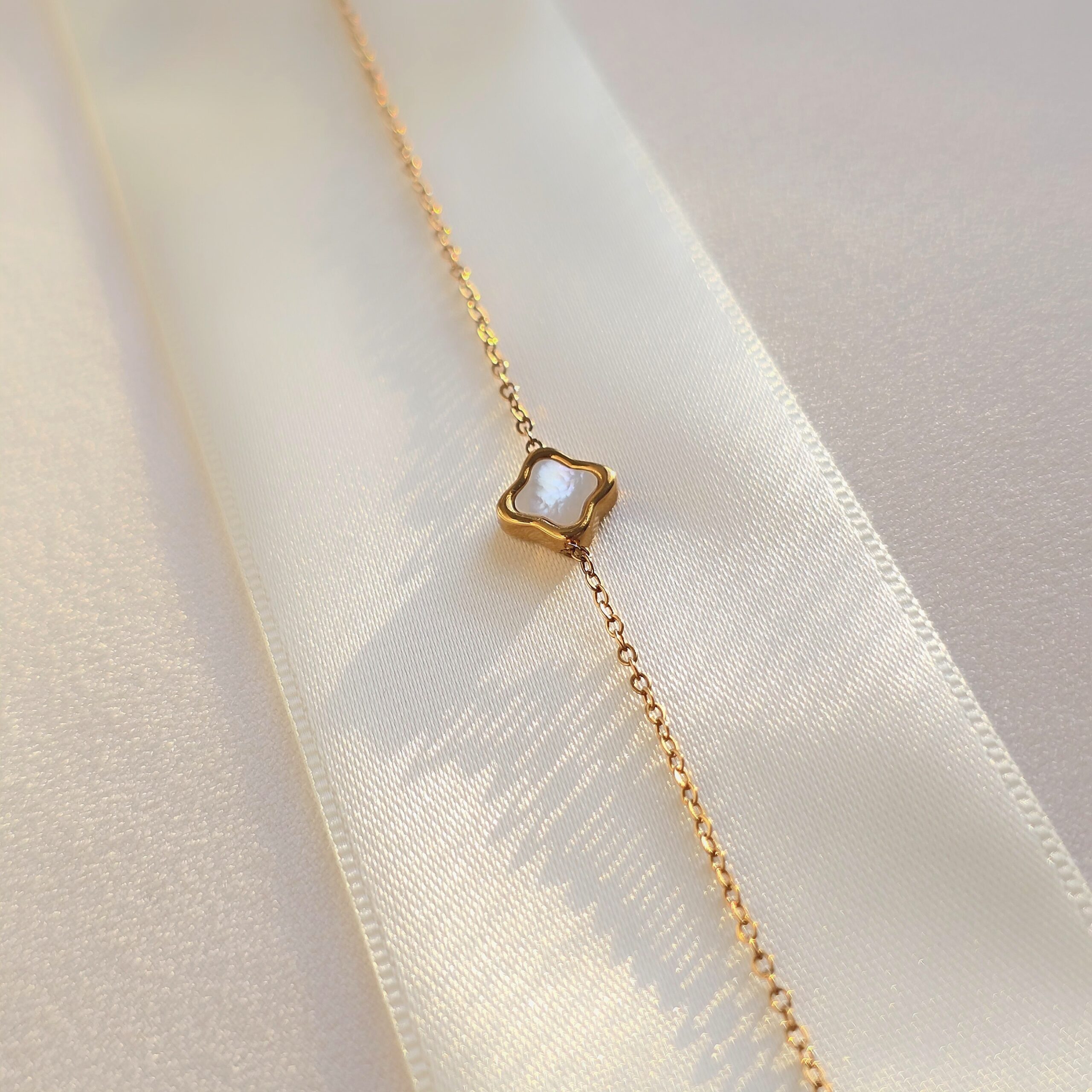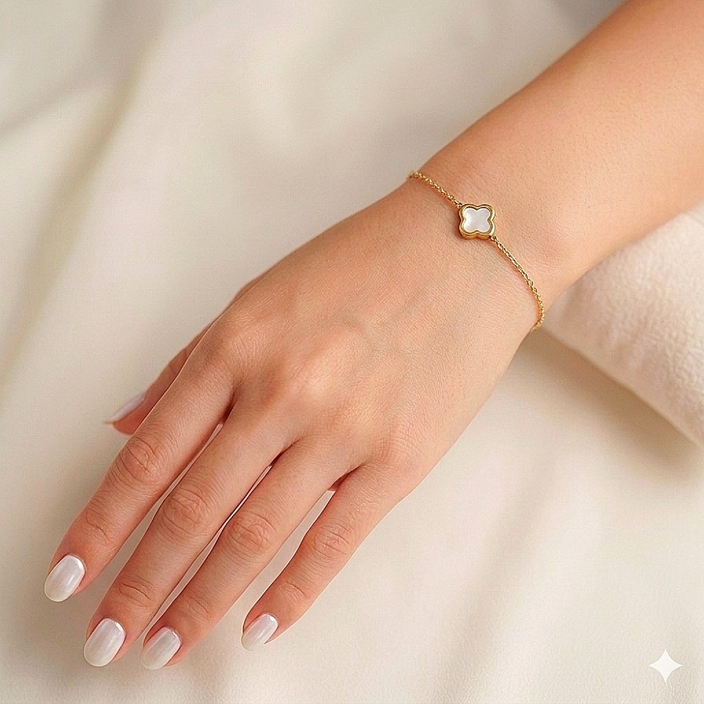 Ce bracelet se compose d’une chaine fine et délicate en acier inoxydable avec un pendentif trèfle en nacre blanche irisée