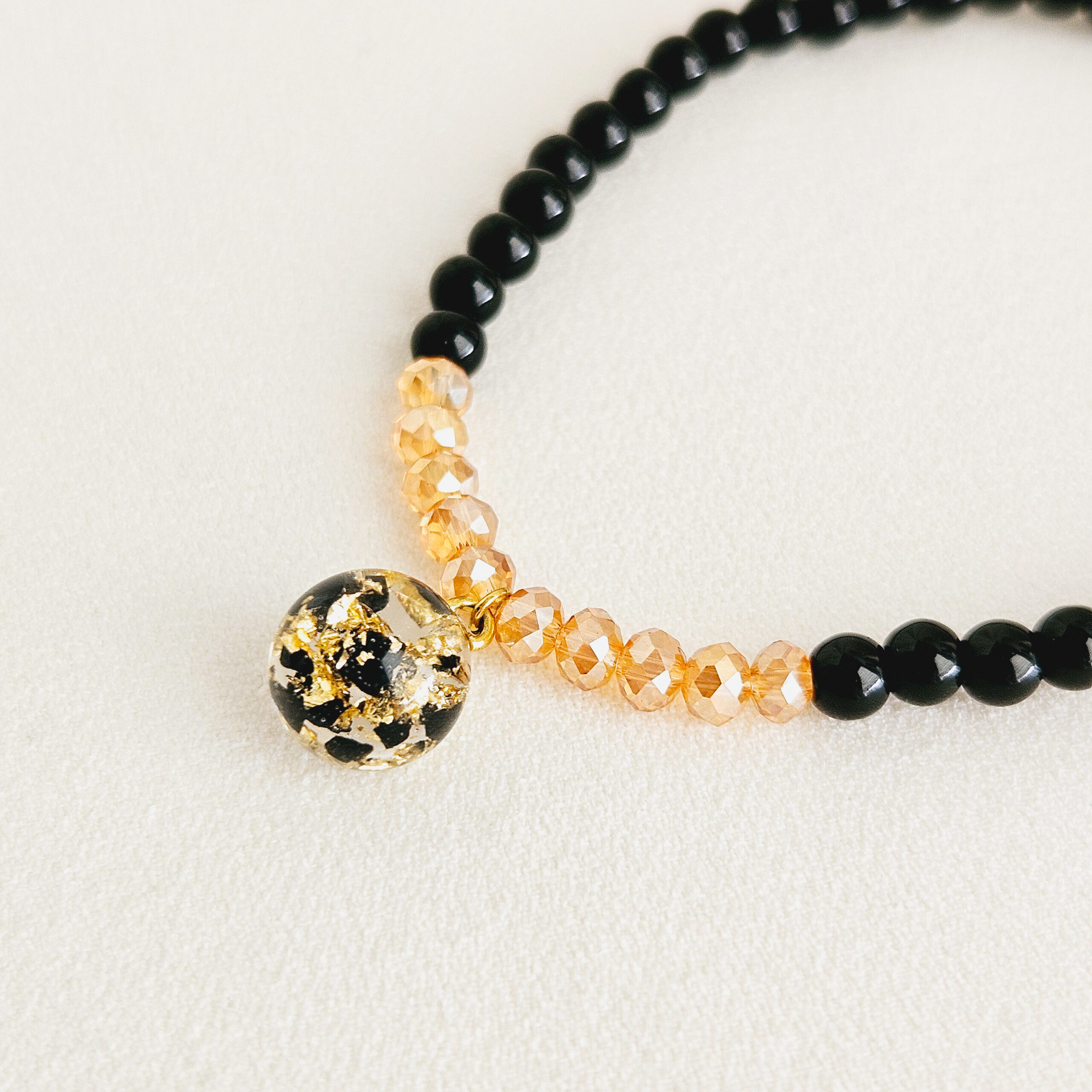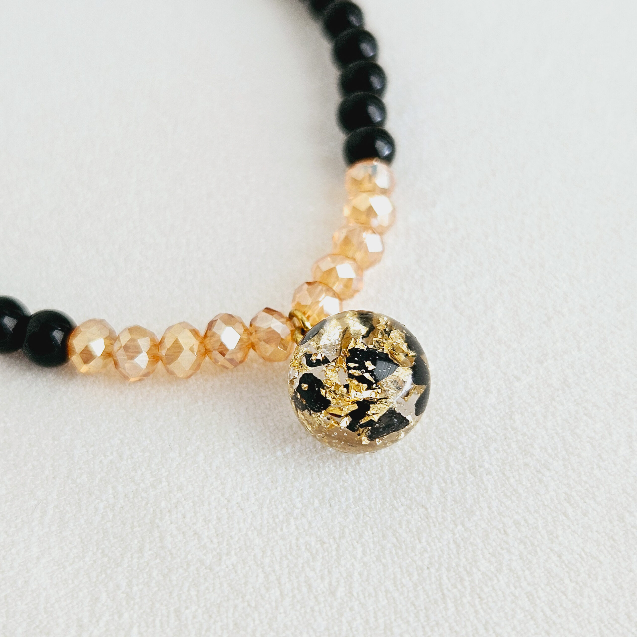 et d’une breloque en résine de haute qualité avec des fines feuilles d’or et fragments de charbon noir.