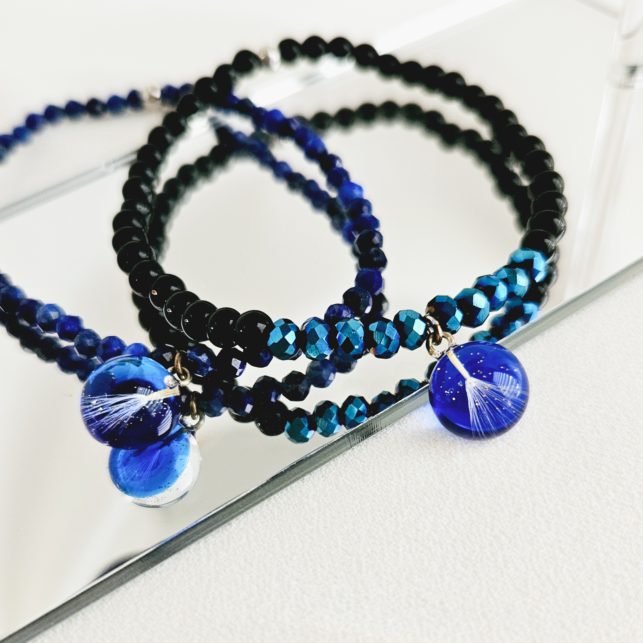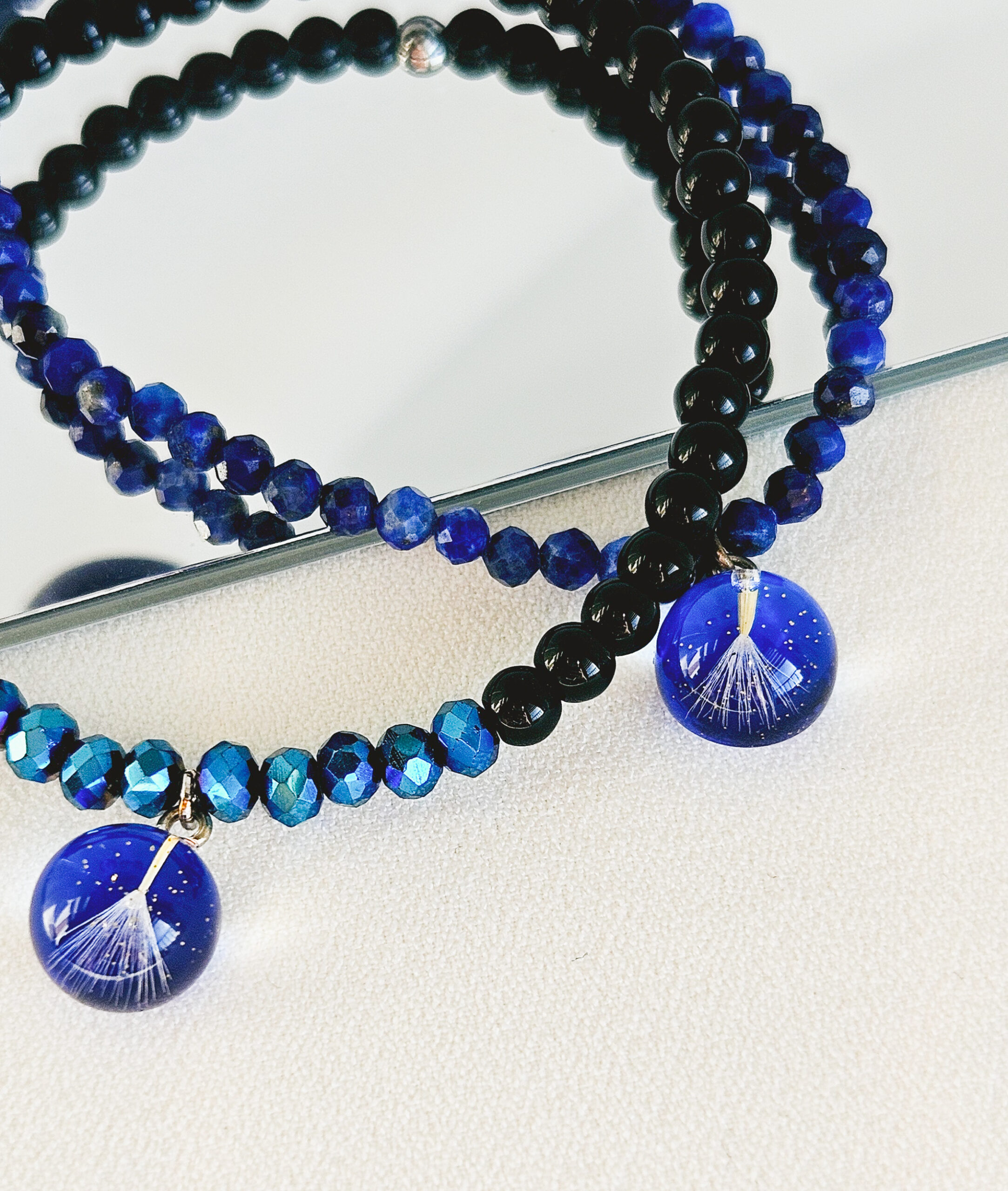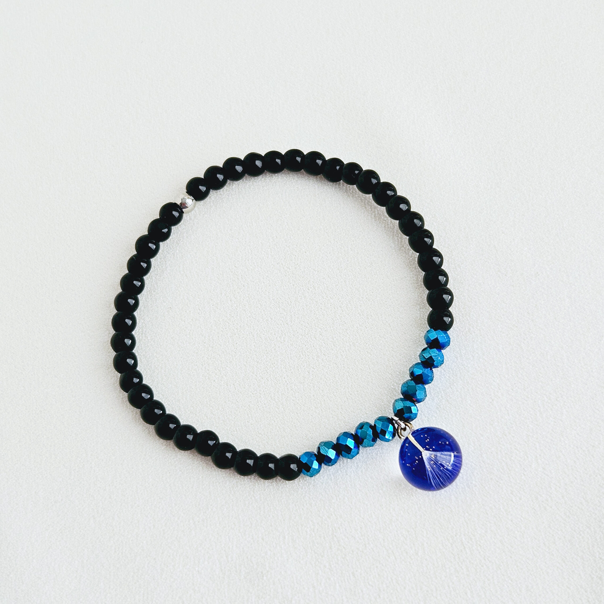 Bracelet en élastique composé de perles en pierre naturelles ( onyx noir, perle facette bleu)