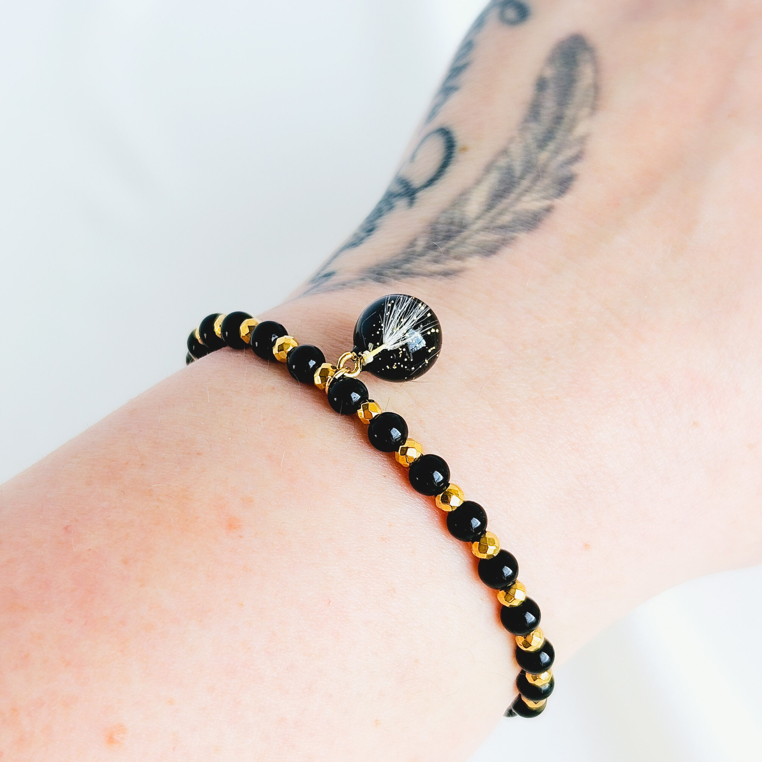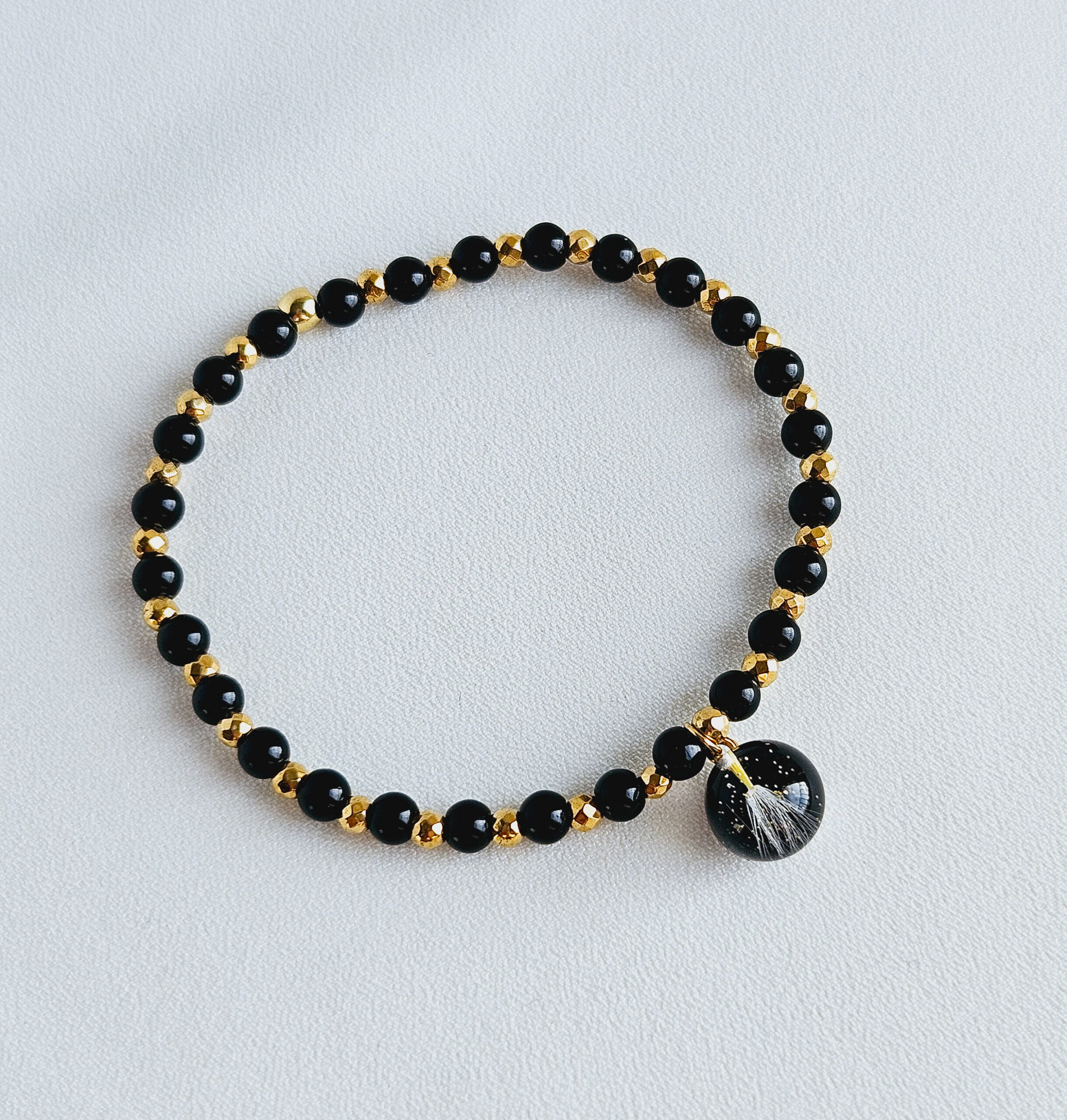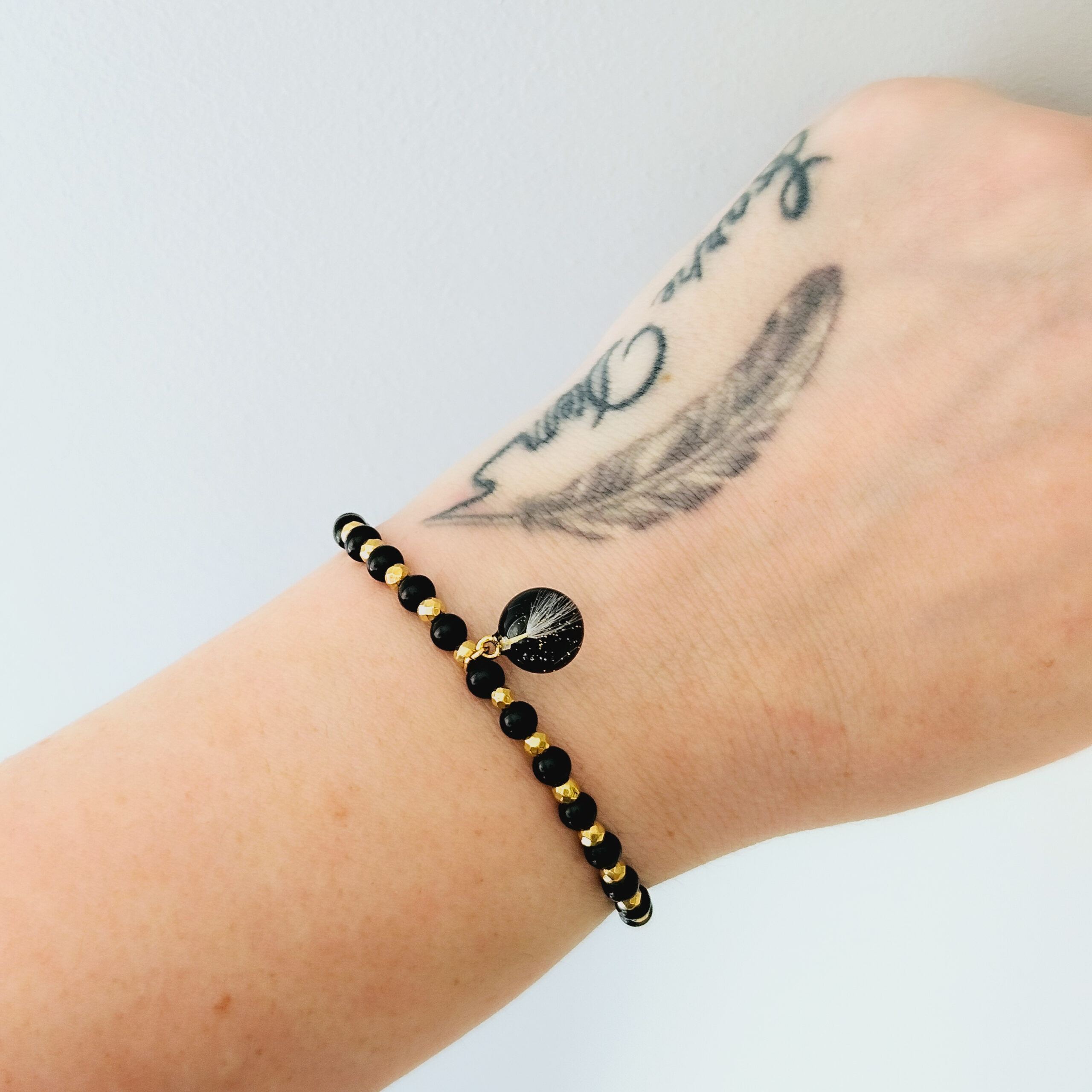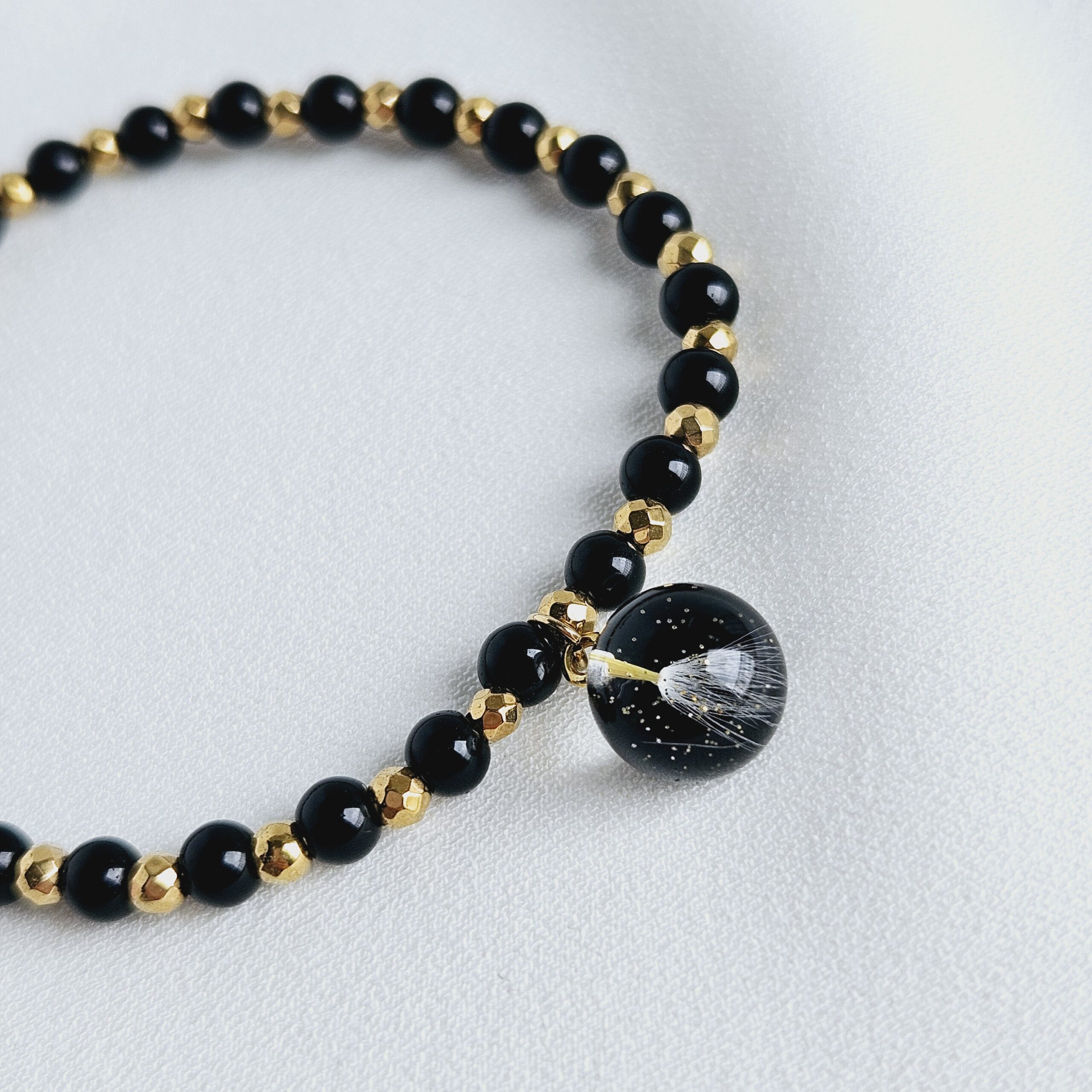 Bracelet en élastique composé de perles en pierre naturelle d’onyx noir, hématite doré et d’une breloque en résine de haute qualité et pissenlits, paillettes dorées.