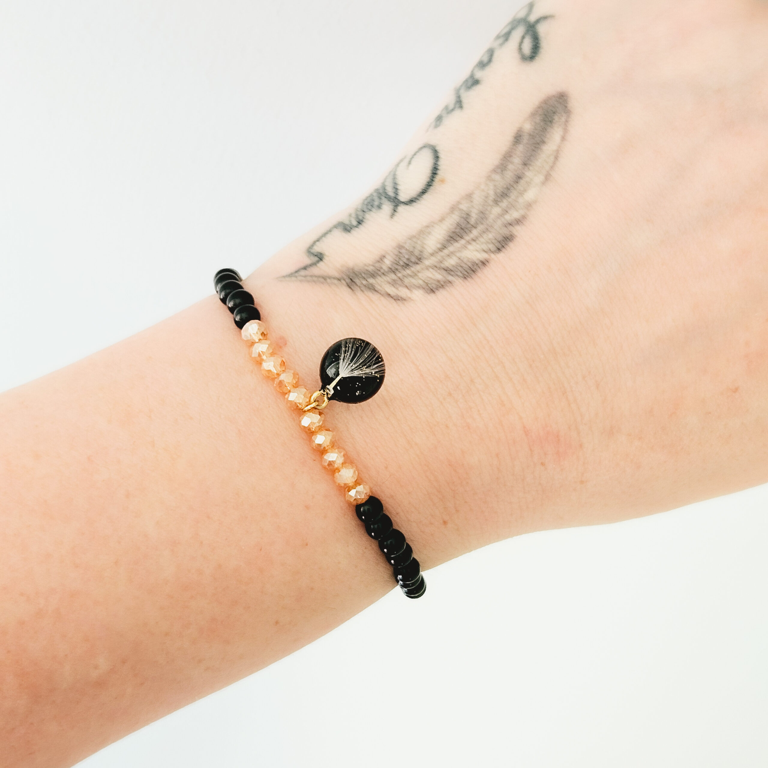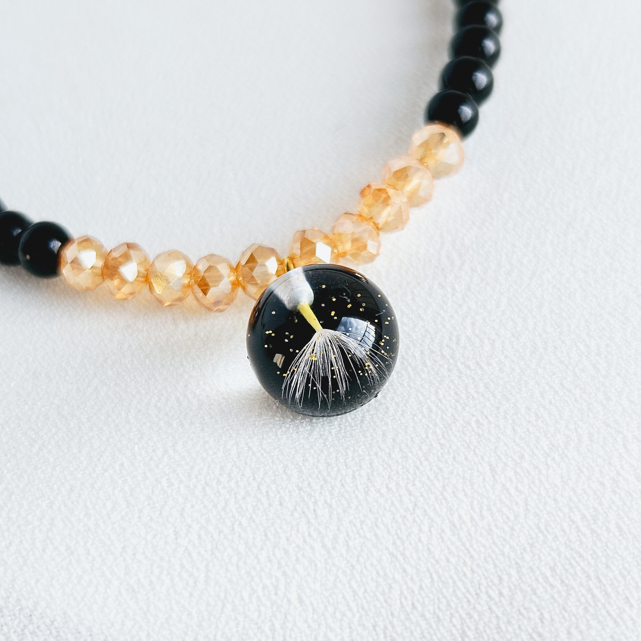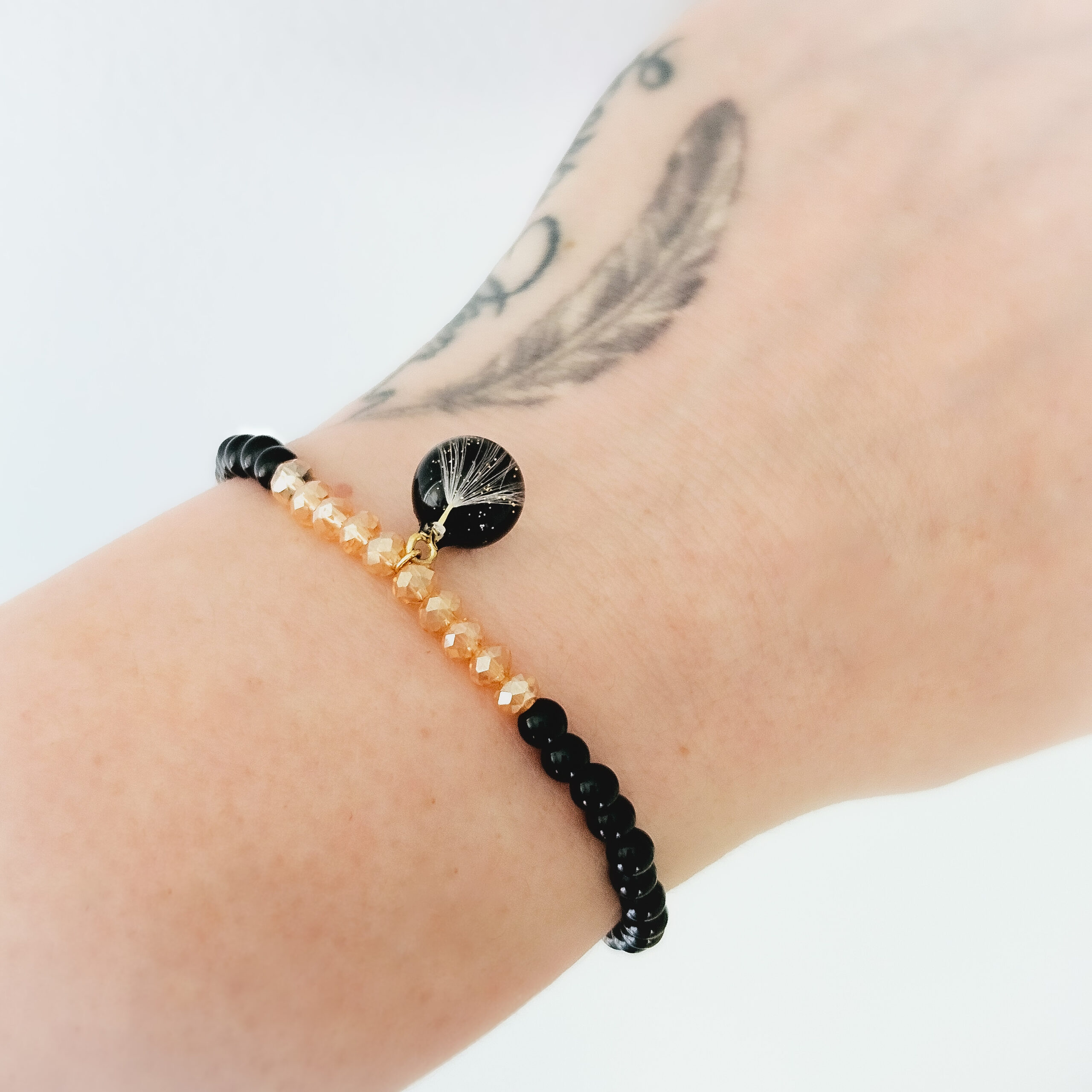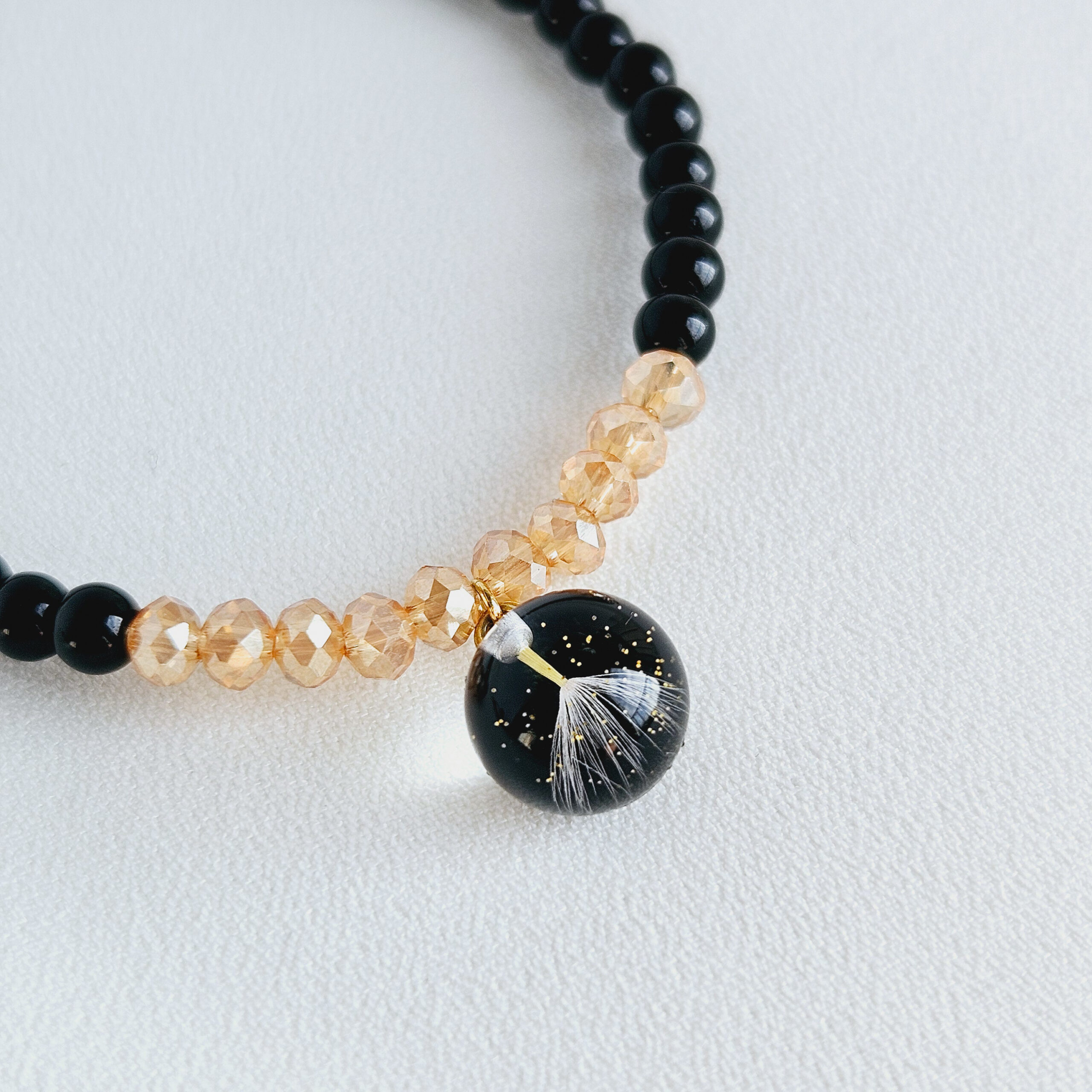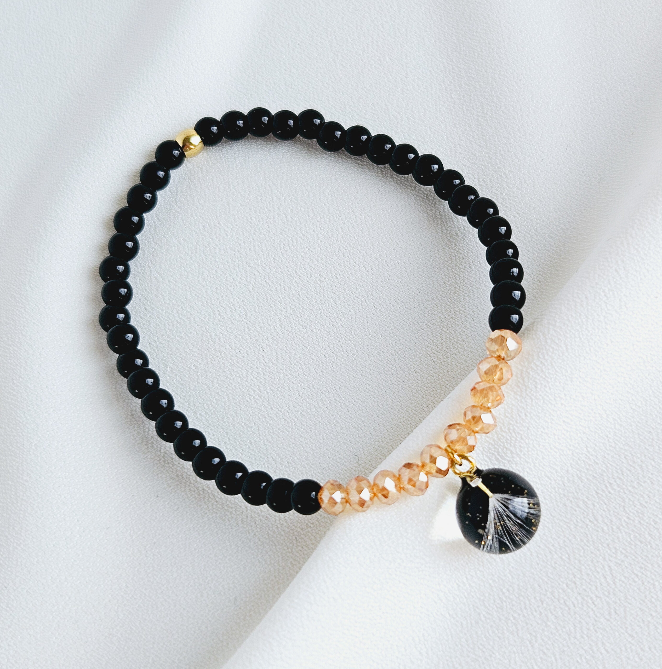 Bracelet en élastique composé de perles en pierre naturelles ( onyx noir, citrine) et d’une breloque en résine de haute qualité et pissenlits, paillettes dorées.
