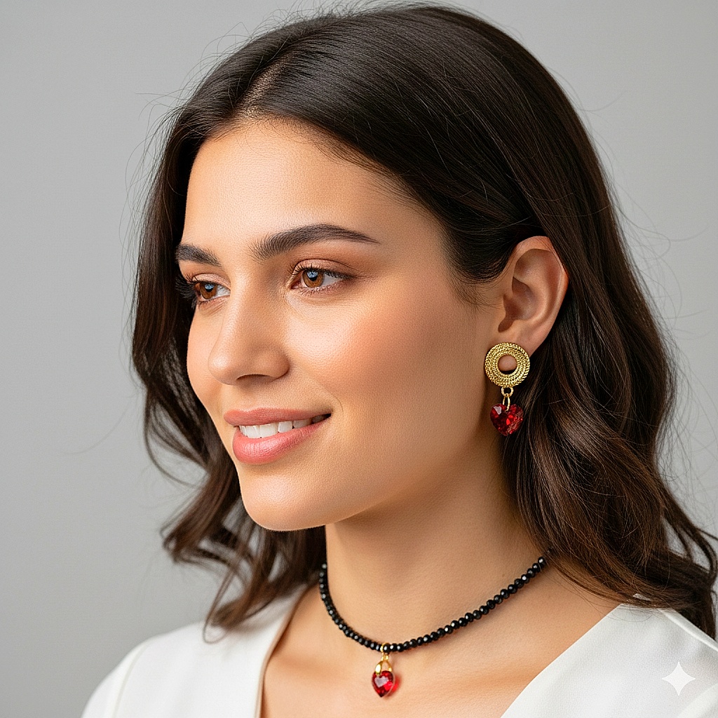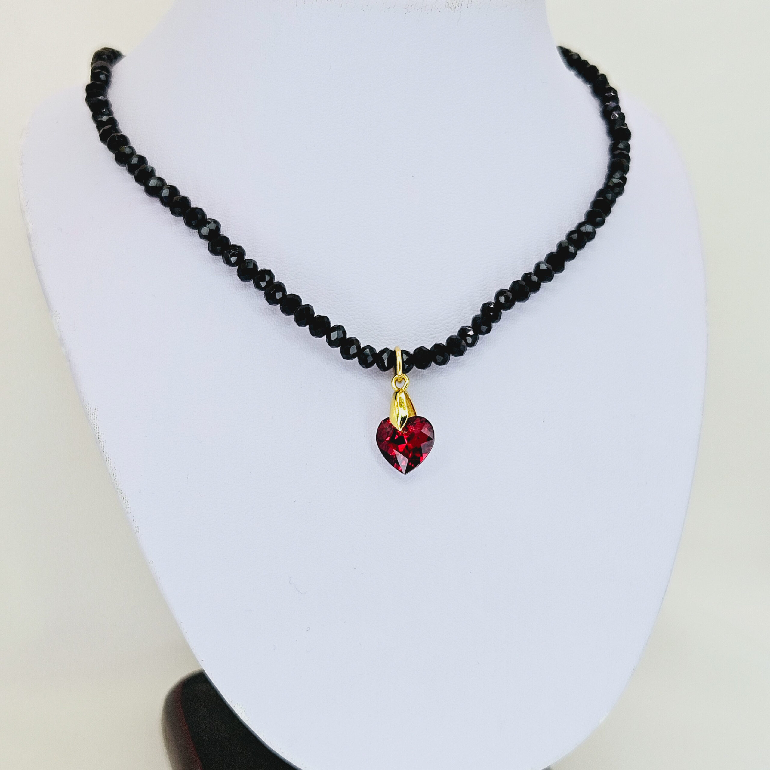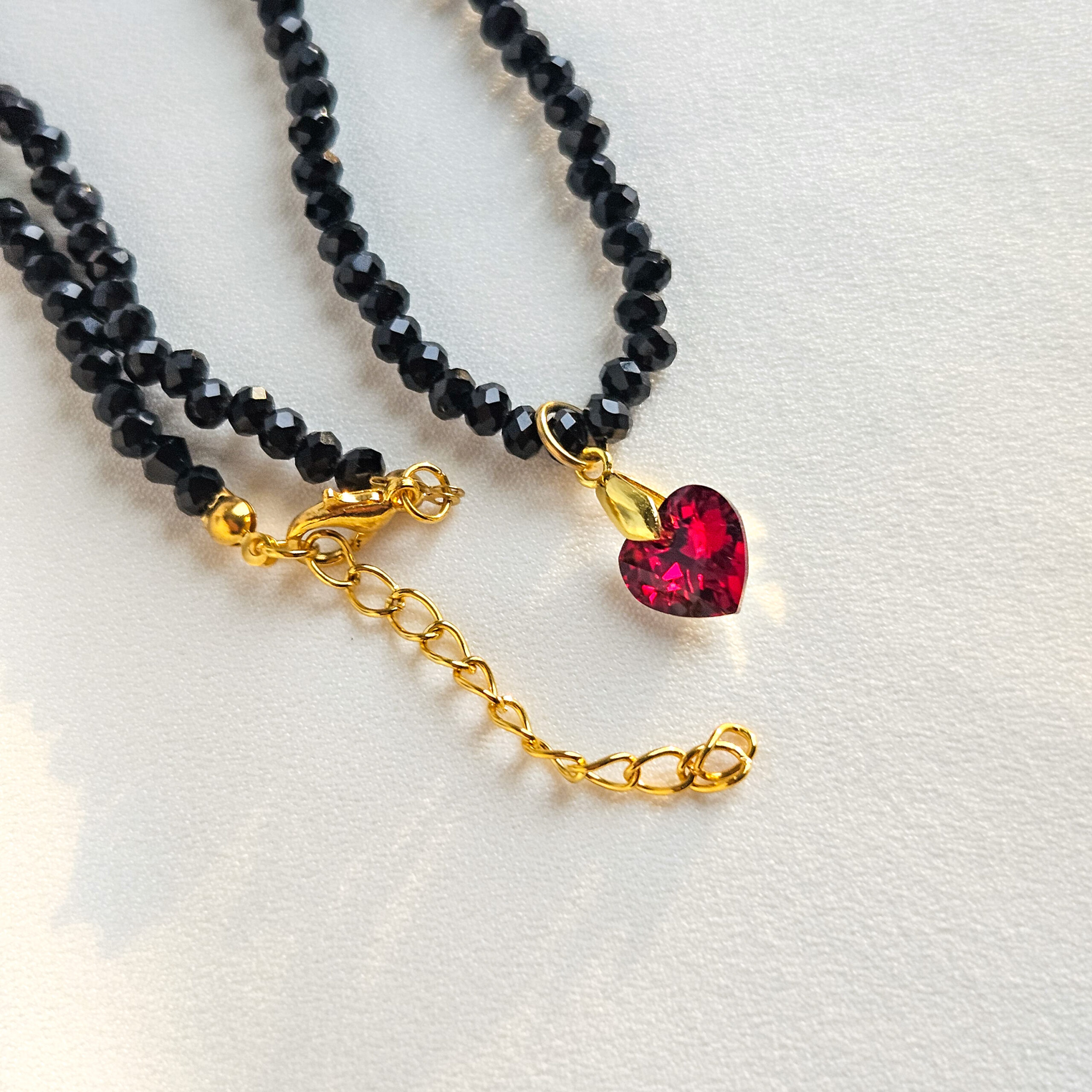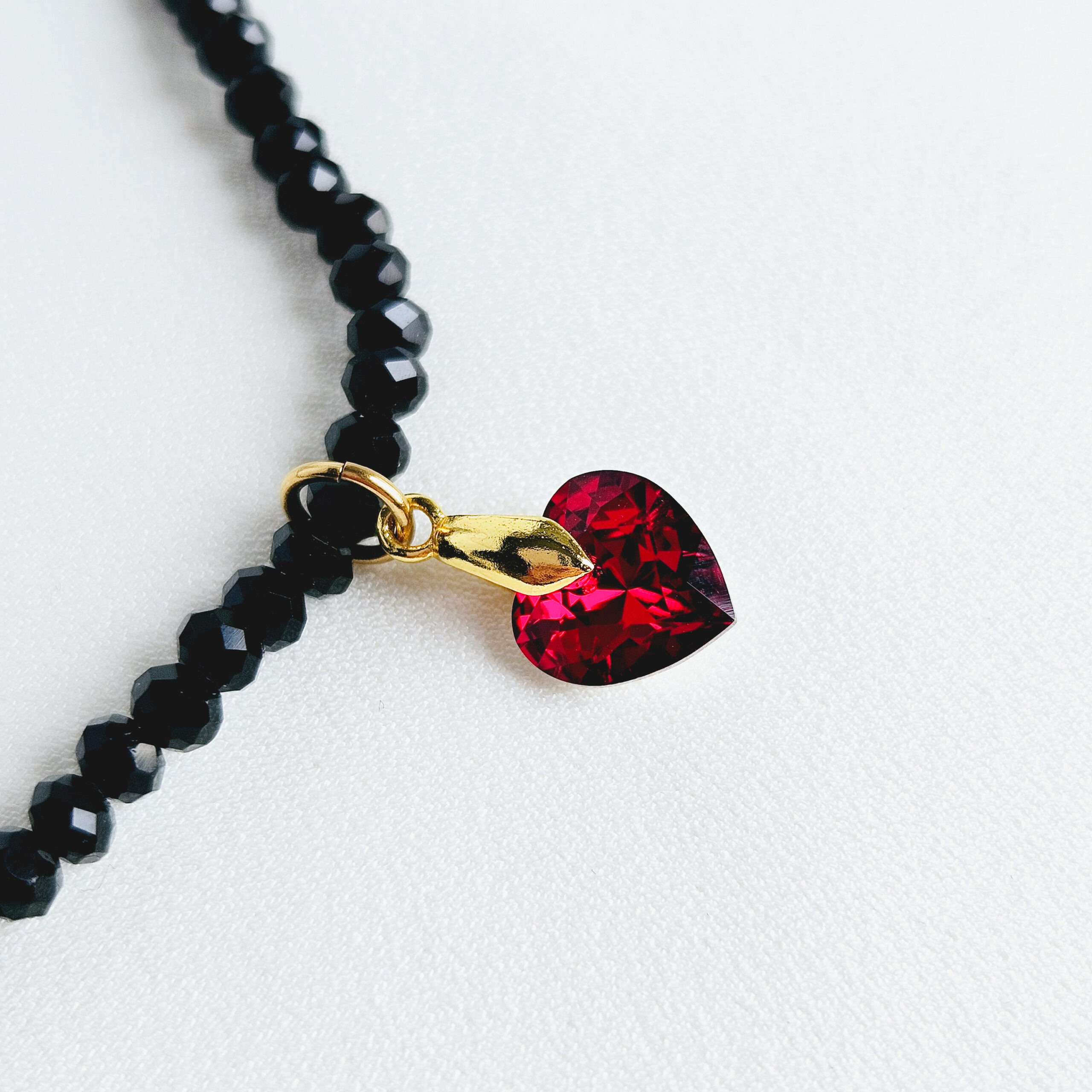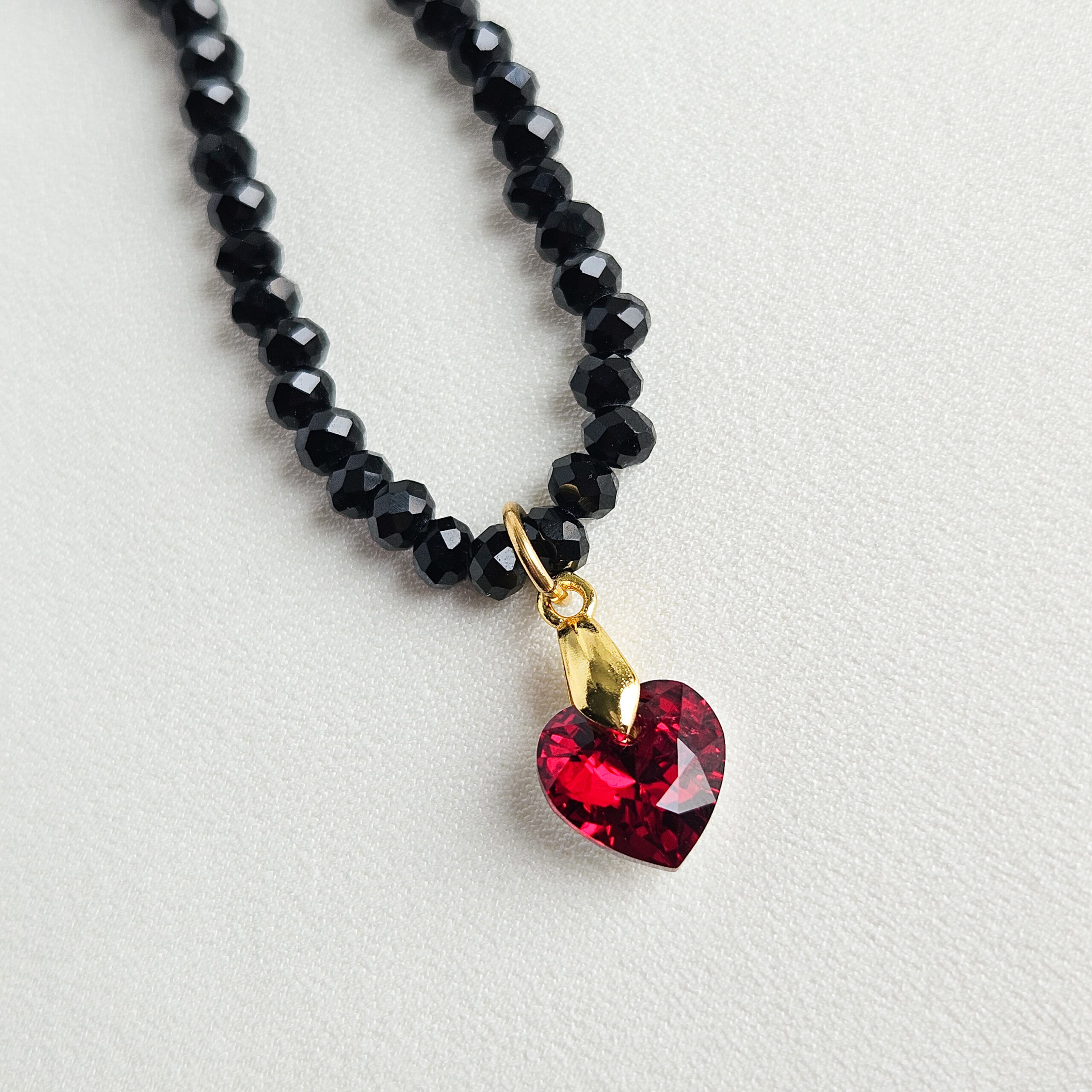 L’association de perles noires facettées et de pendentifs en cristal rouge rubis crée un visuel captivant et luxueux.
