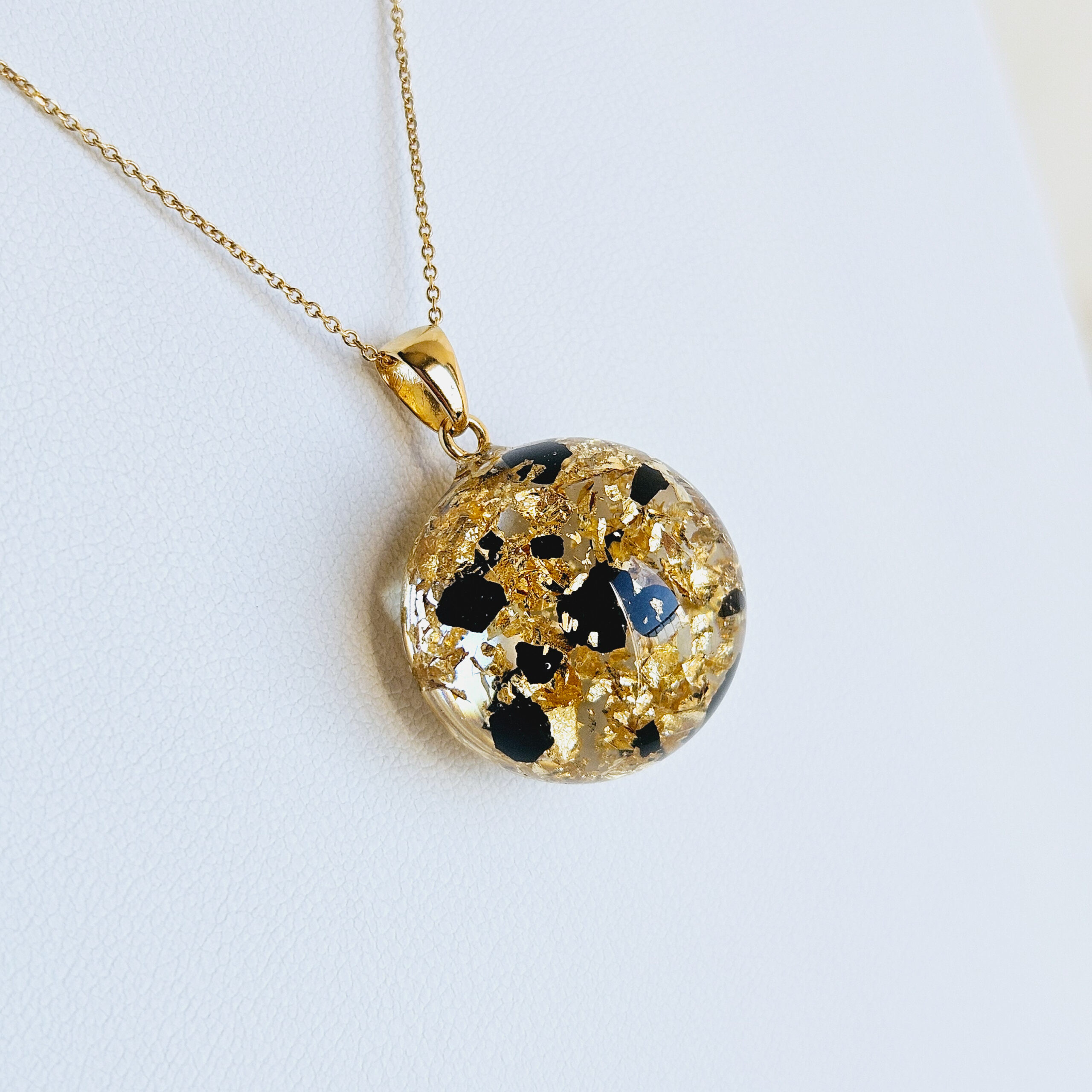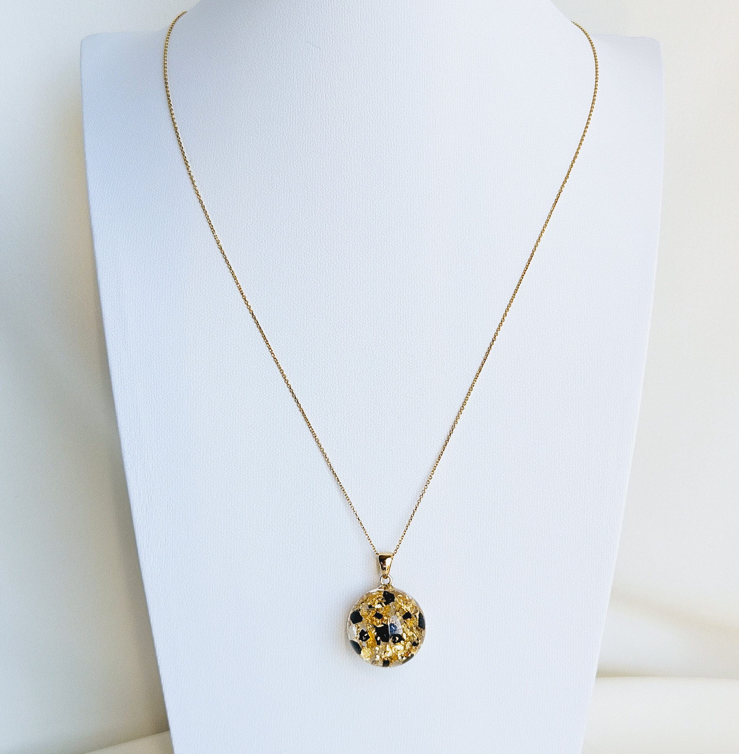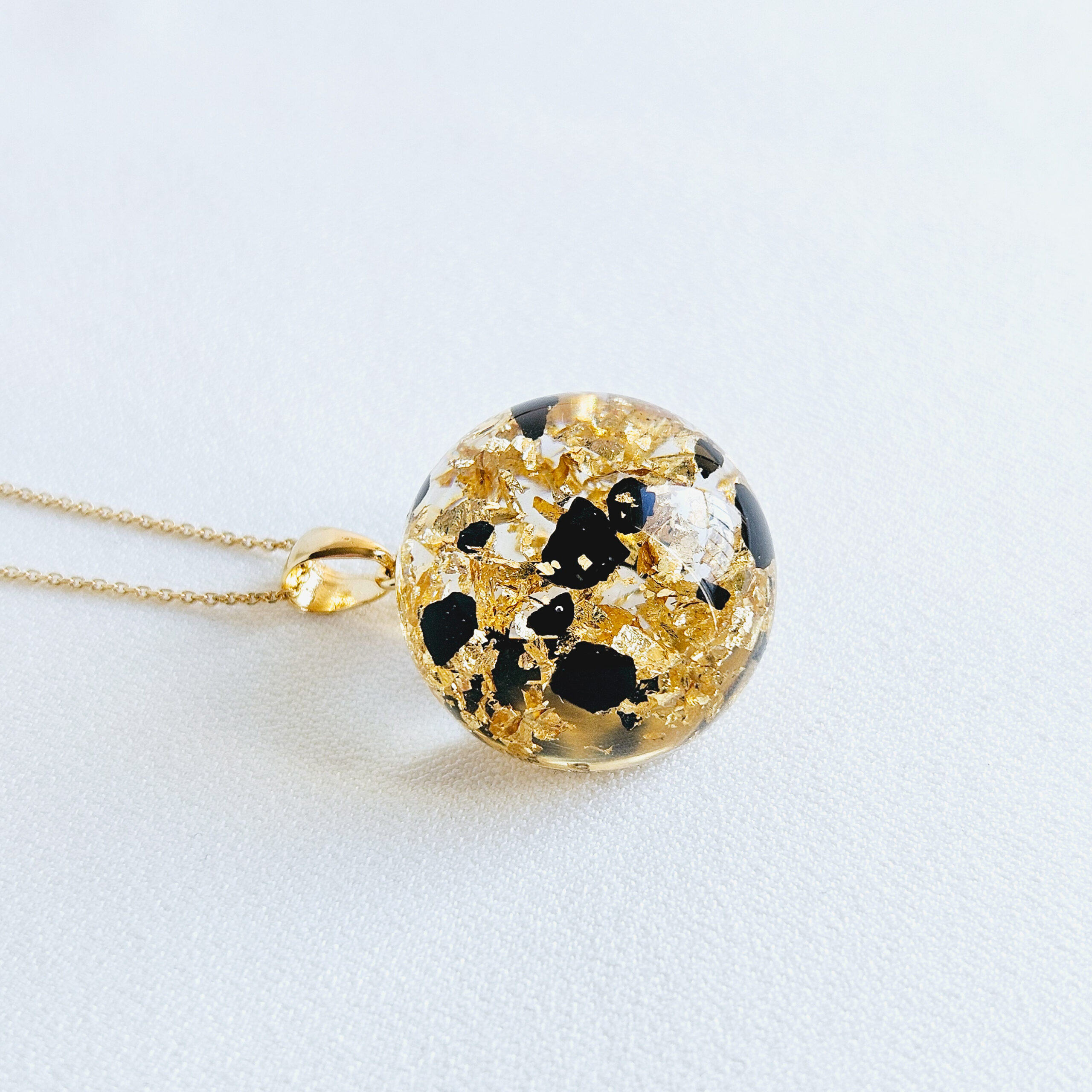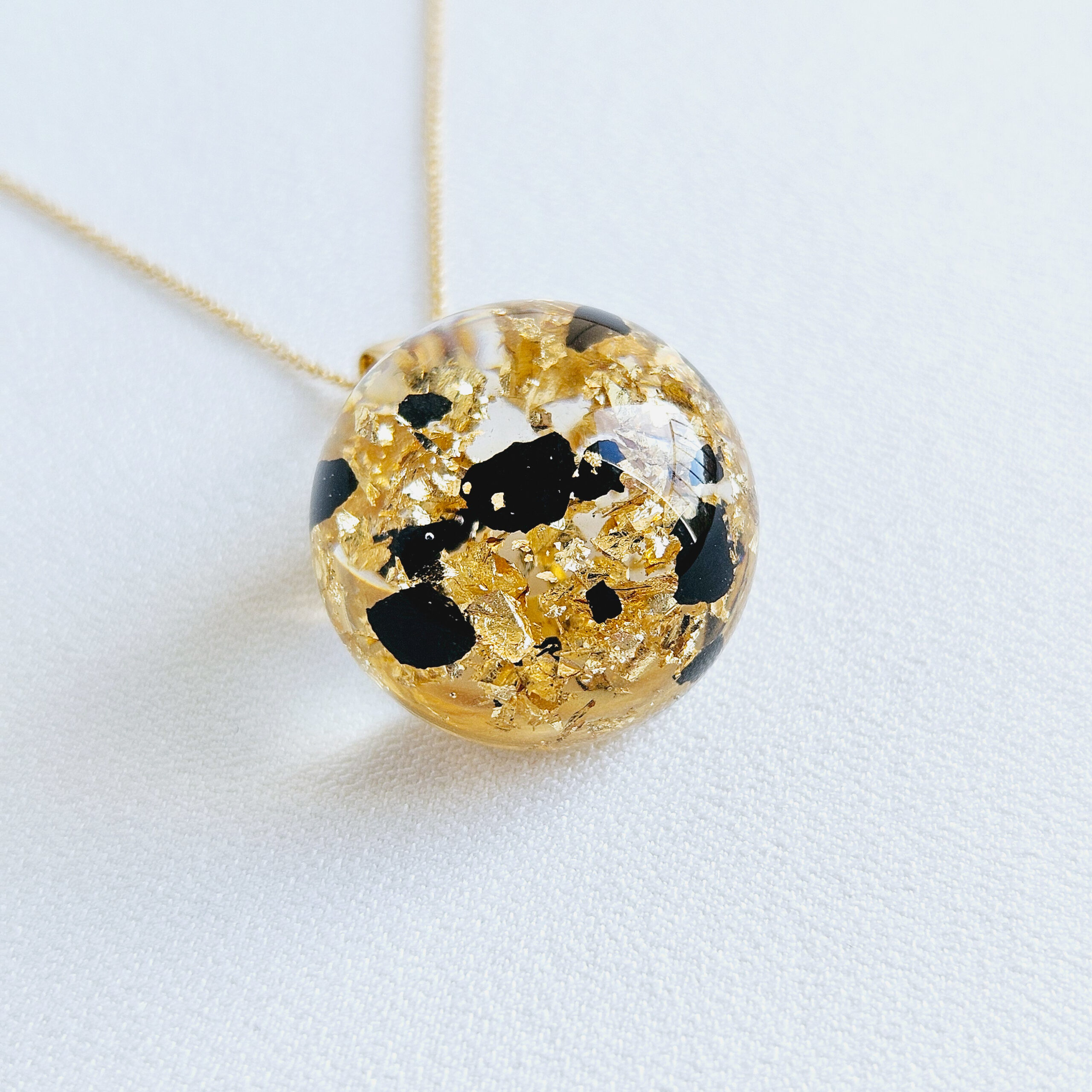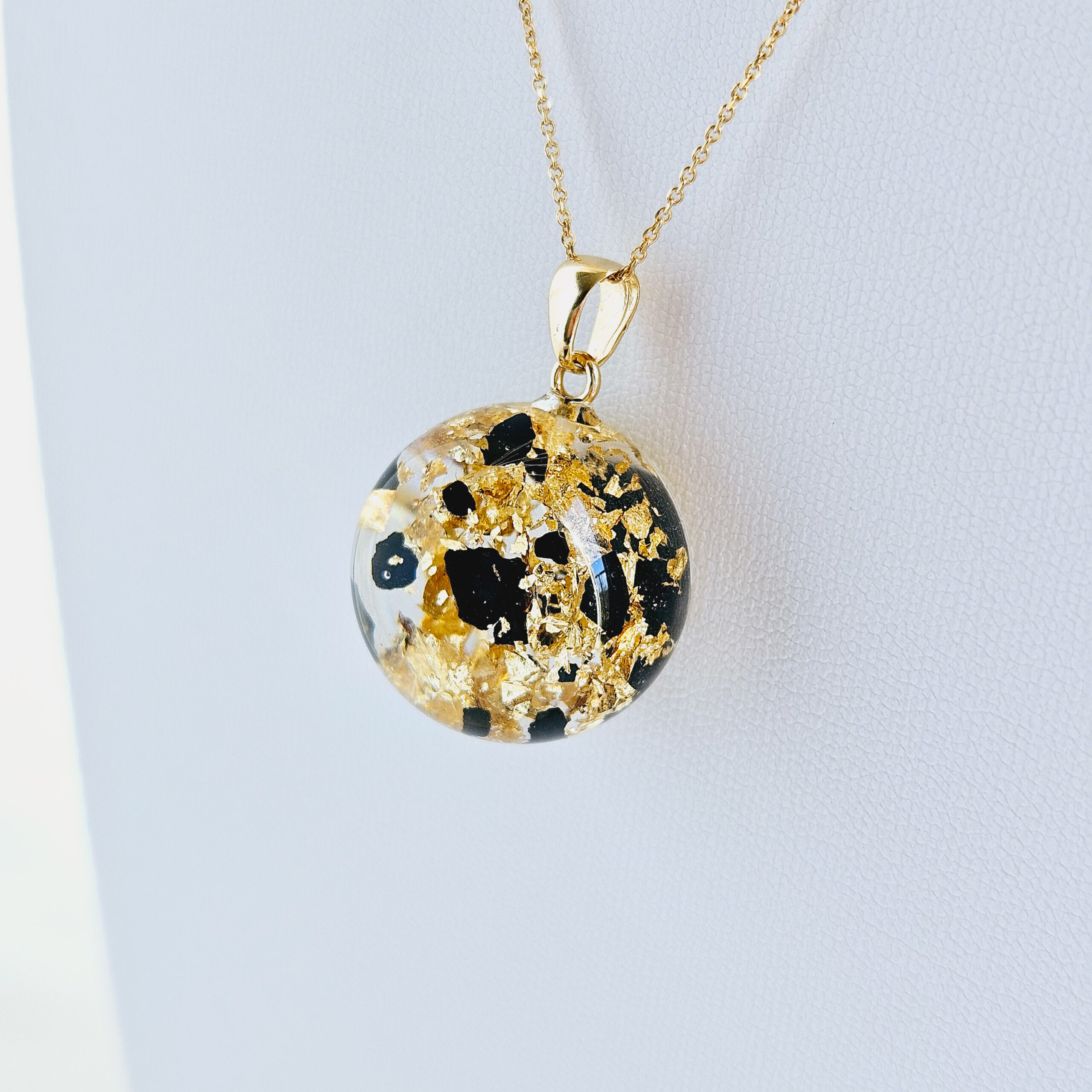 Le collier en argent plaqué or avec un pendentif boule en résine de haute qualité et de fines feuilles d’or et fragments de charbon noir.