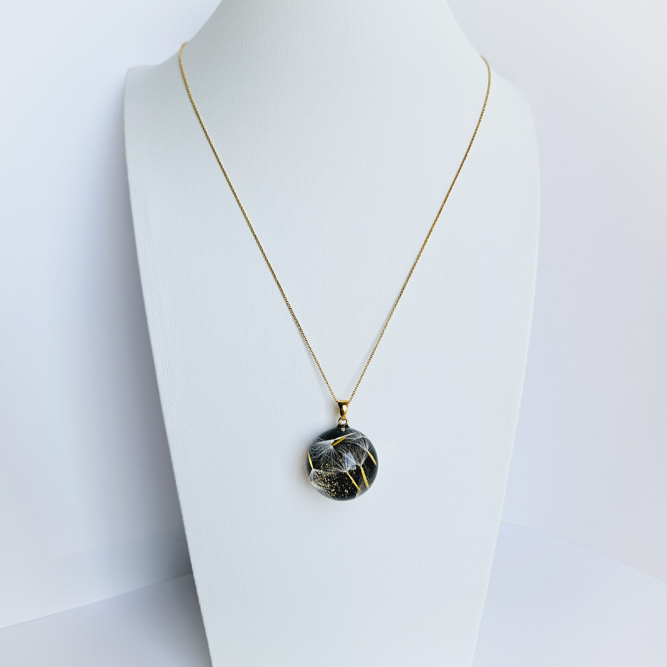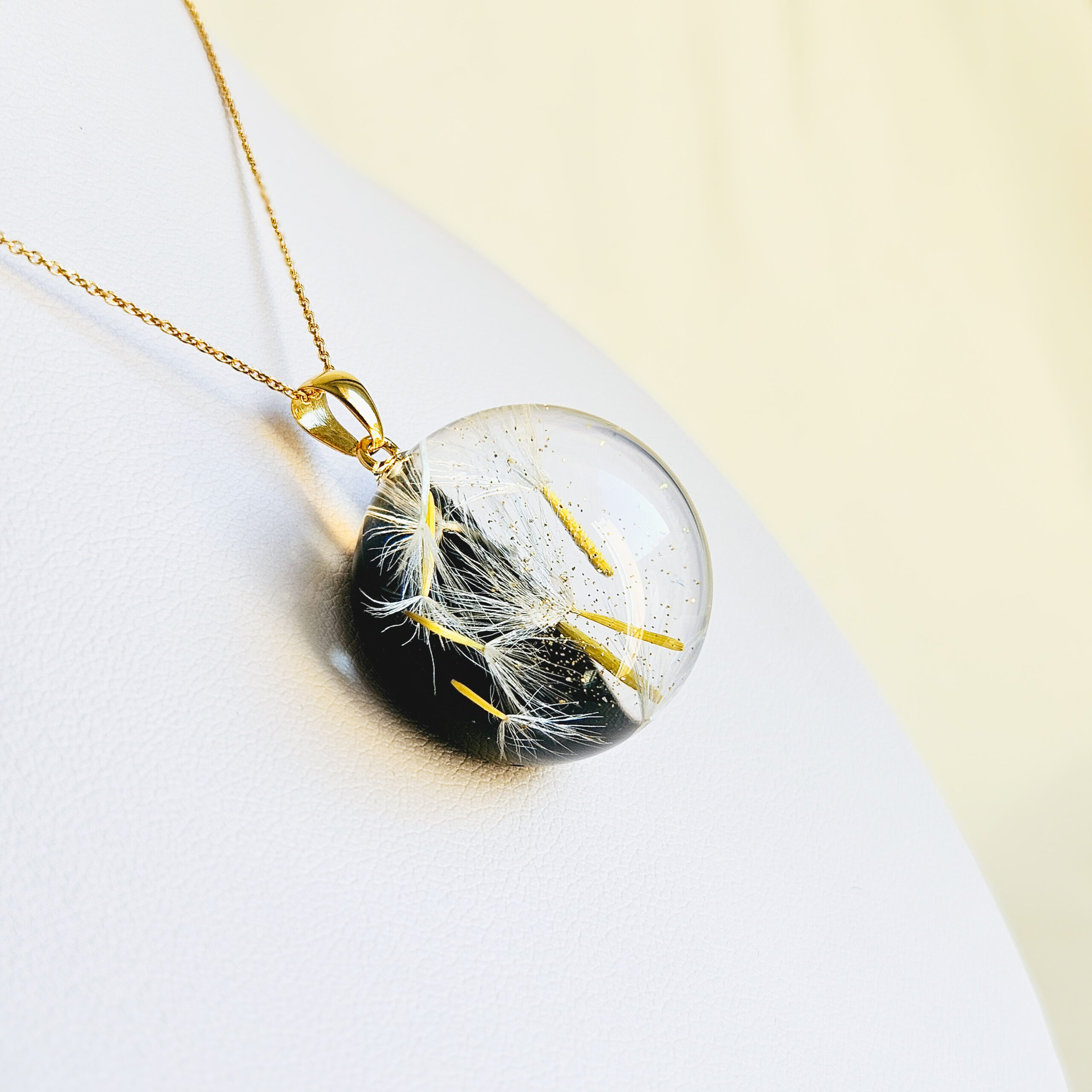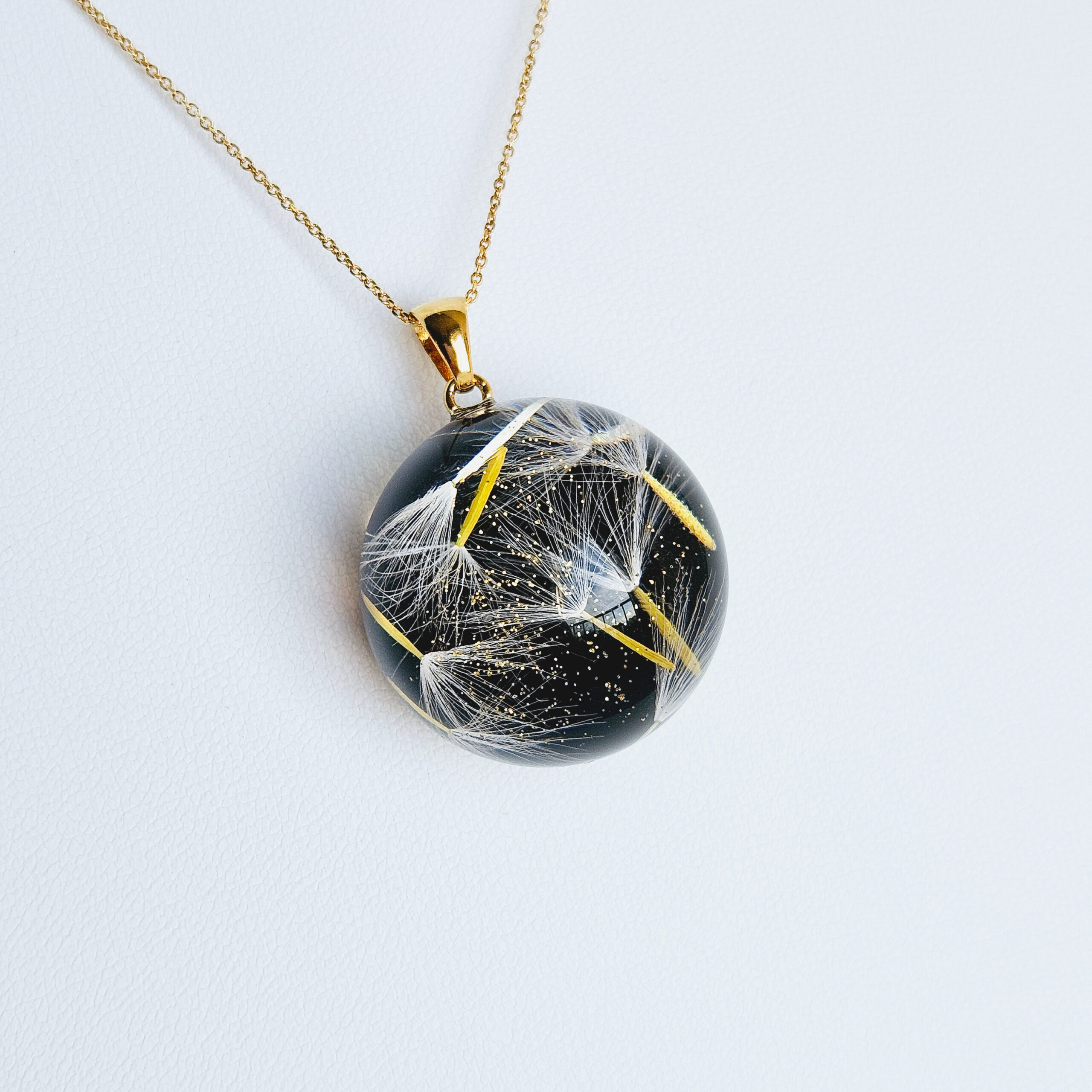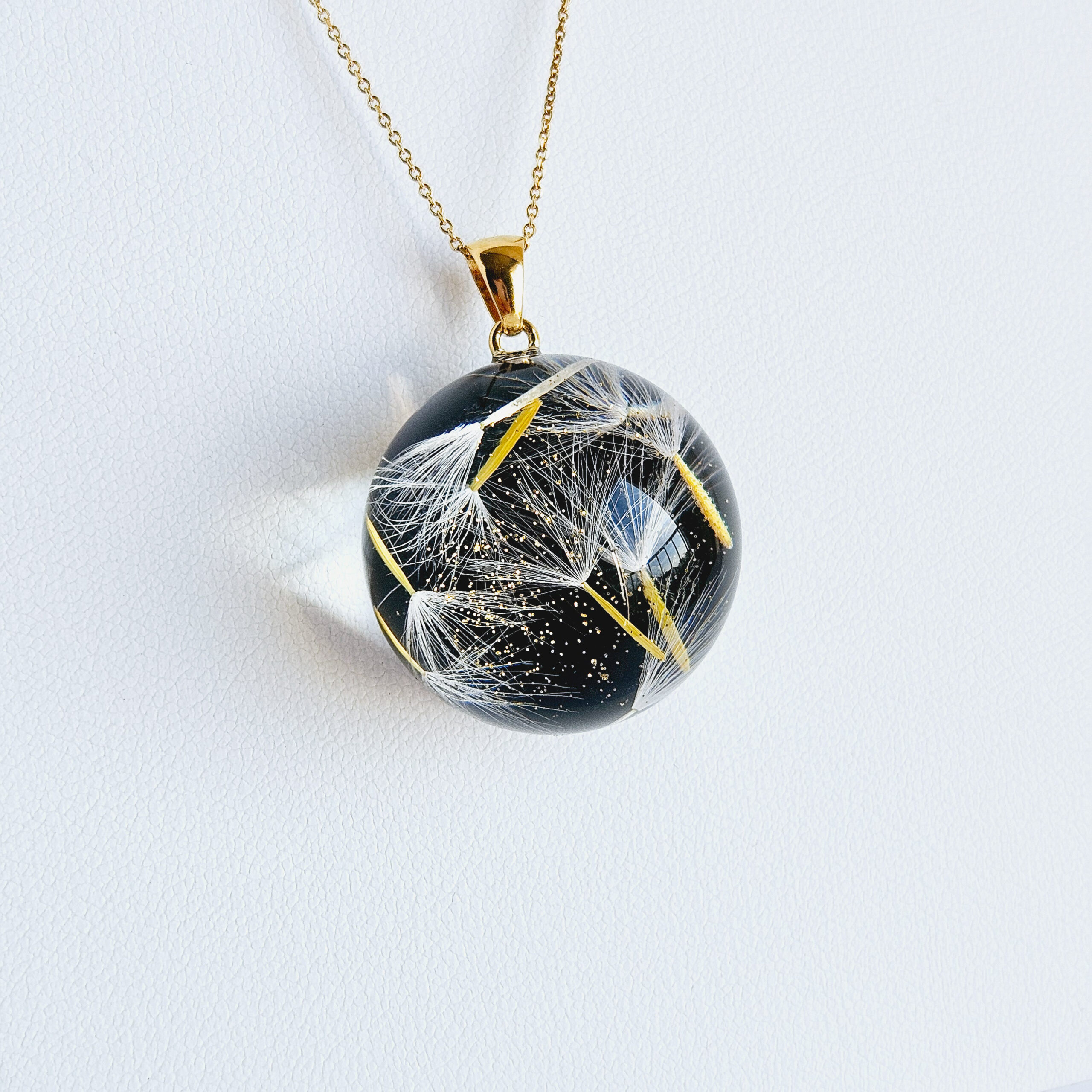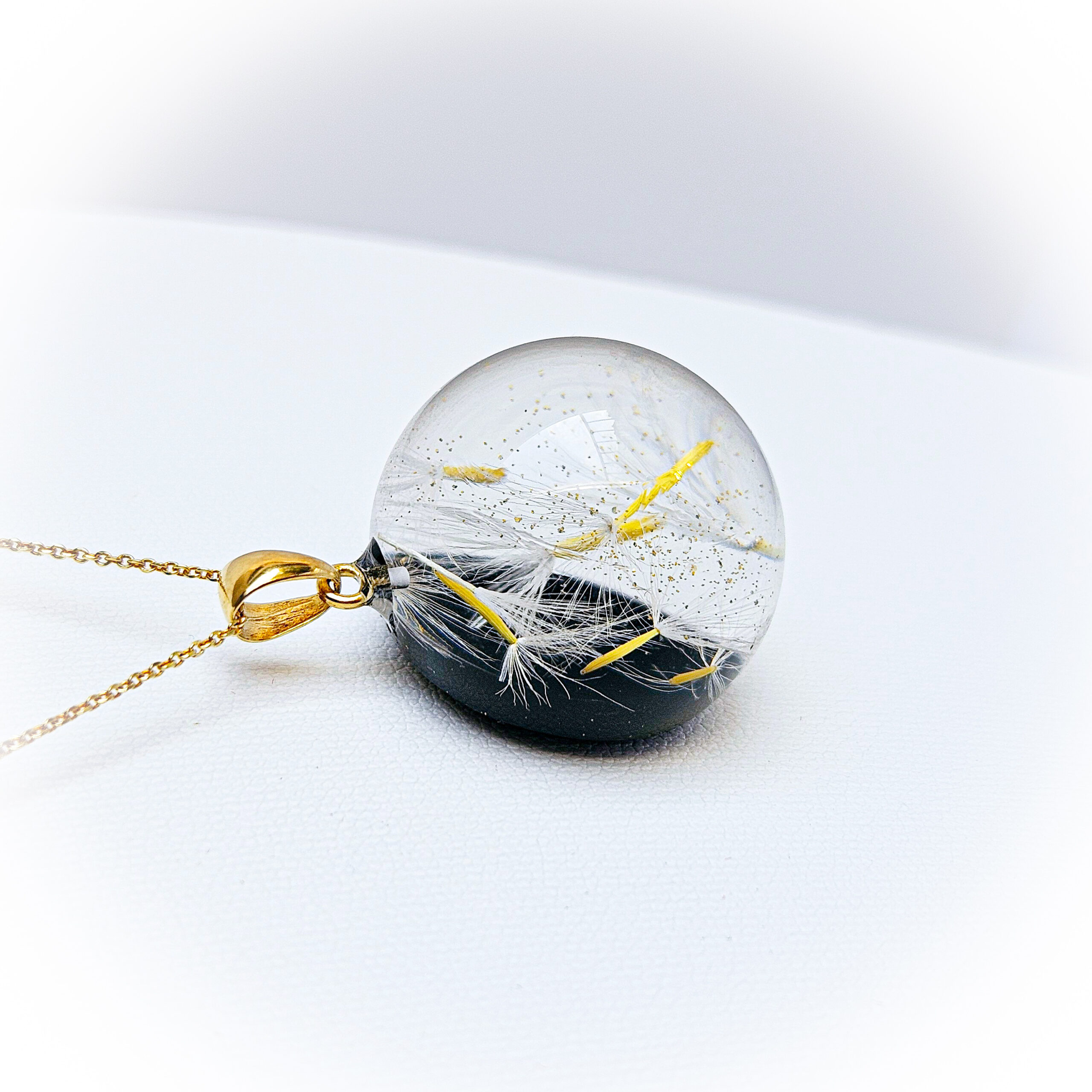 Le collier en argent plaqué or avec un pendentif boule en résine de haute qualité et pissenlits, paillettes dorées.